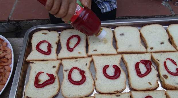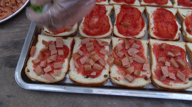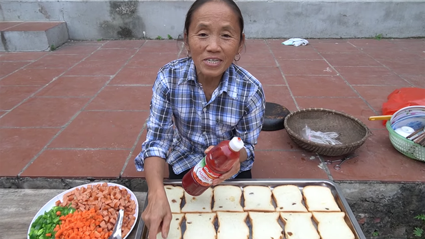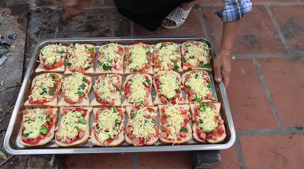 Mới đây, cũng nhờ cách nướng này, bà Tân đã thành công mĩ mãn với món pizza được làm từ bánh mì sandwich. Để làm được món này, bà đã chuẩn bị loại bánh mì cắt lát, xúc xích, ớt chuông, cà rốt và tất nhiên, không thể thiếu phô mai. Các nguyên liệu được cắt miếng nhỏ, phủ lên từng miếng bánh mì, sau đó bà Tân dùng một chiếc khay úp lại và nướng bằng cách thủ công quen thuộc. Phô mai tan chảy, các loại rau củ và xúc xích được làm chín. Nhờ đó, bà dễ dàng làm thành công 2 khay pizza "siêu to khổng lồ".
