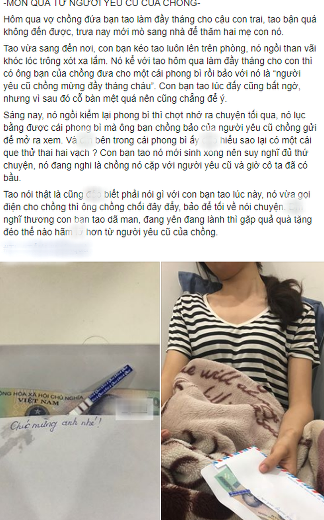 Theo lời kể của bạn thân cô vợ đáng thương này, vào ngày tổ chức tiệc đầy tháng con, có một người bạn của chồng đưa phong bì nói là "người yêu cũ chồng mừng đầy tháng cháu". Tuy nhiên, vì lúc đó quá lu bu khách khứa nên cô vợ không để ý.