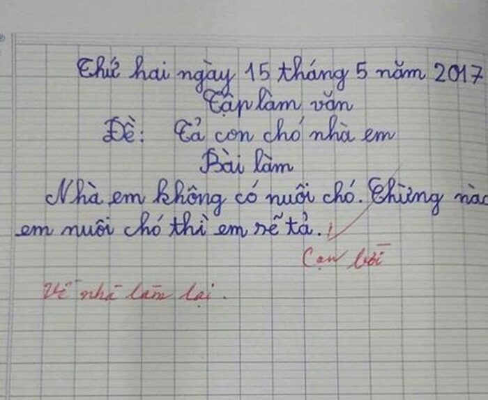 Thế nhưng, em học sinh này lại thật thà đến mức, thú nhận thẳng trong bài văn rằng "nhà em không có nuôi chó, chừng nào em nuôi chó thì em sẽ tả".