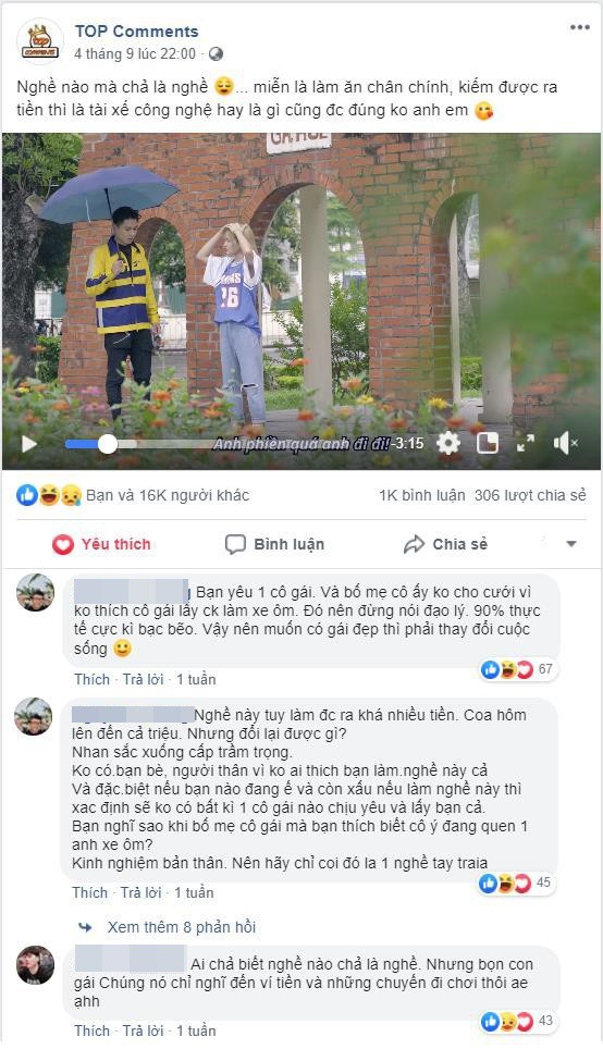 Tuy nhiên, nếu kén con rể là tài xế công nghệ, nhiều ông bố bà mẹ chưa chắc đã đồng ý gả con gái cho. Bình luận dưới clip, Phạm Tiến (23 tuổi, TP HCM) còn chia sẻ thêm câu chuyện chinh phục được bạn gái, nhưng lại chẳng thể vượt qua "ải" bố mẹ vợ tương lai.