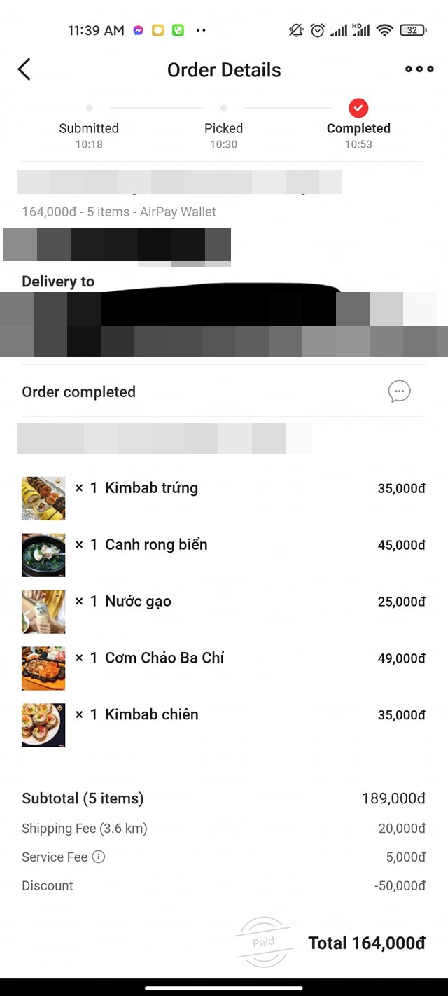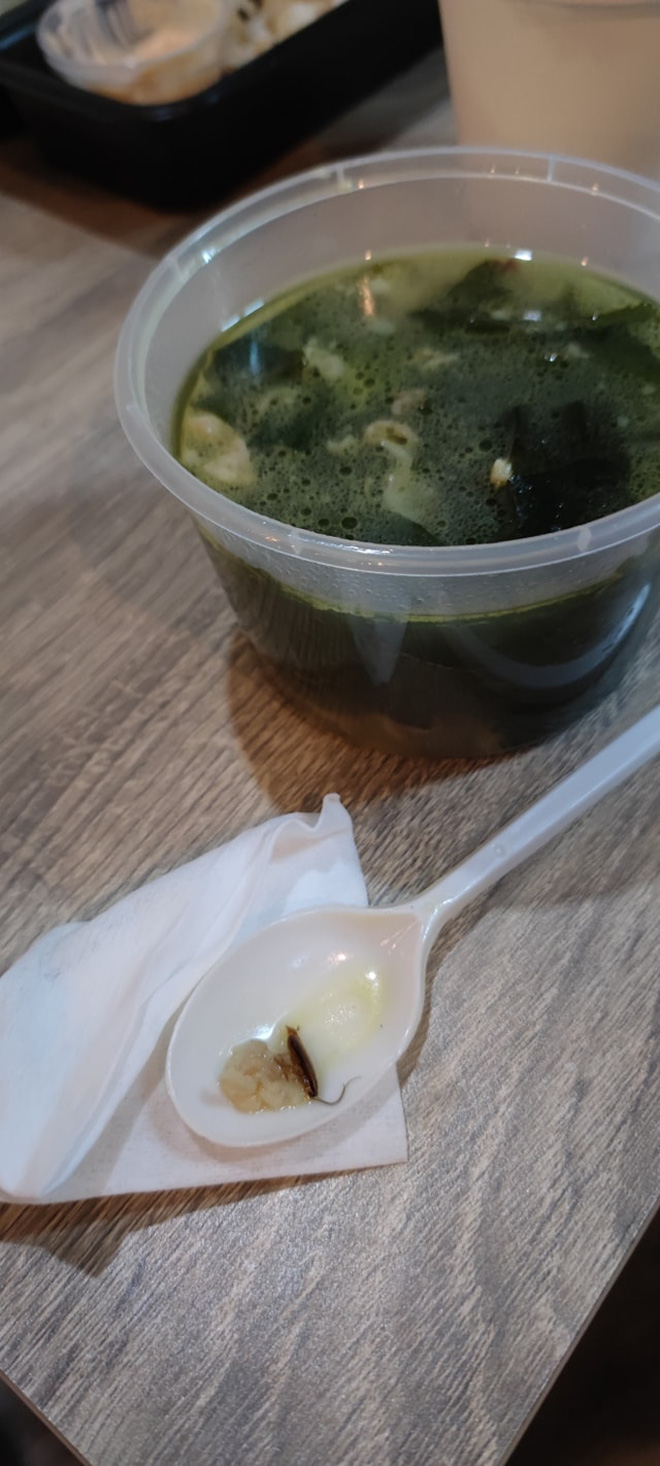 Ngay sau khi phát hiện ra côn trùng trong thức ăn, khách hàng này đã liên hệ với quán ăn và yêu cầu đổi canh. Tuy nhiên đến hiện tại vẫn chưa nhận được đồ ăn đổi. Giá tiền anh chàng phải trả cho bữa ăn không rẻ, riêng món canh rong biển "côn trùng" là 45.000 đồng chưa kể tiền ship.