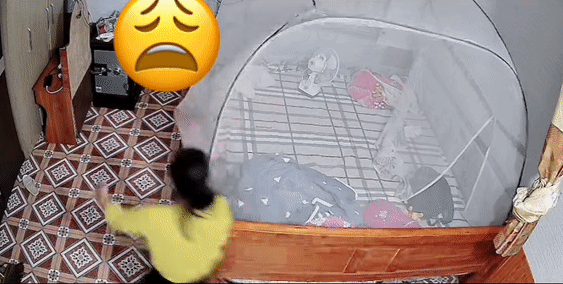 Cụ thể, vụ việc được camera trong phòng ngủ ghi lại hình ảnh một em bé khoảng gần 2 tuổi đang chơi trên giường, quanh giường là một chiếc màn khung bao phủ.