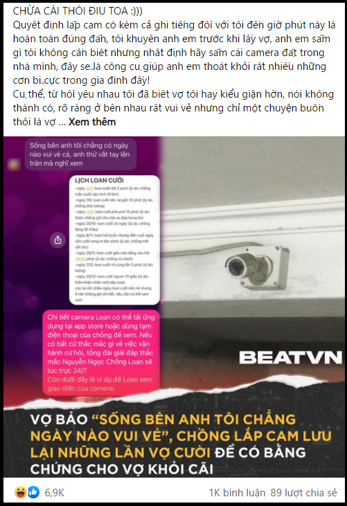 "Quyết định lắp cam có kèm cả ghi tiếng đối với tôi đến giờ phút này là hoàn toàn đúng đắn. Tôi khuyên anh em trước khi lấy vợ, anh em sắm gì tôi không cần biết nhưng nhất định hãy sắm cái camera đặt trong nhà mình, đây sẽ là công cụ giúp anh em thoát khỏi rất nhiều những cơn bĩ cực trong gia đình đấy!