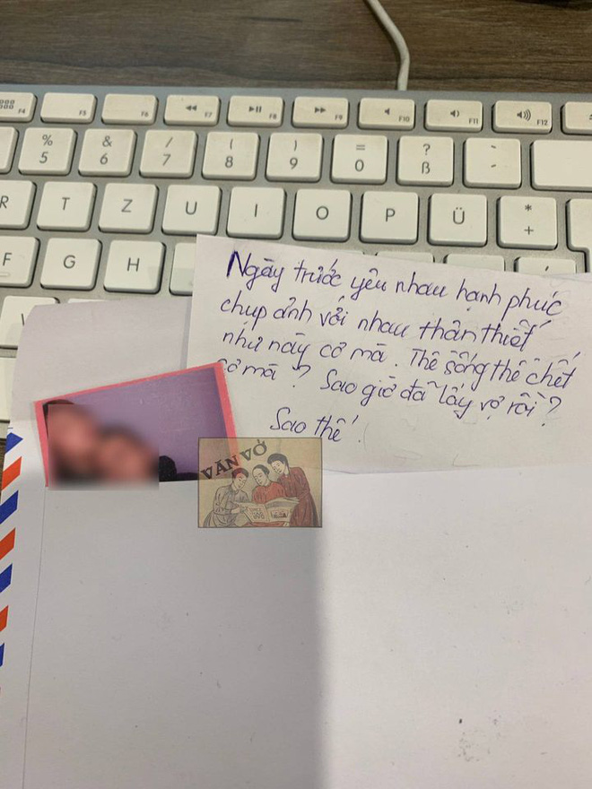 Cô người yêu cũ kia đã gửi một tấm ảnh chụp cô và chú rể khi còn mặn nồng và mẩu giấy viết tay: "Ngày trước yêu nhau hạnh phúc, chụp ảnh với nhau thân thiết như này cơ mà, thề sống thề chết cơ mà, sao giờ đã lấy vợ rồi? Sao thế?".