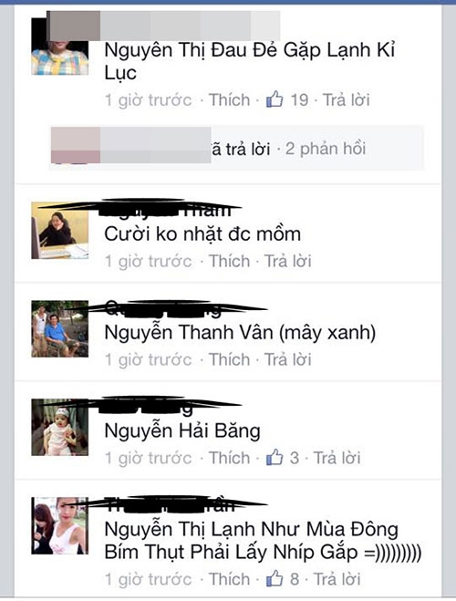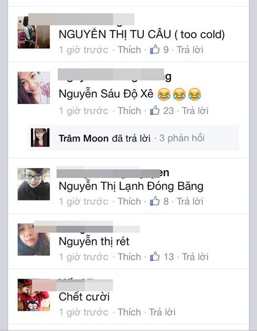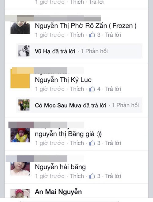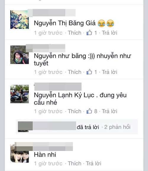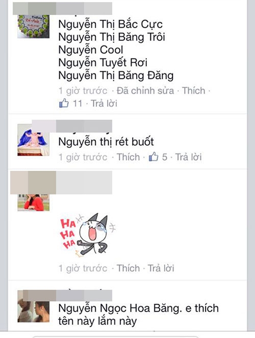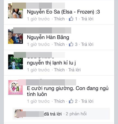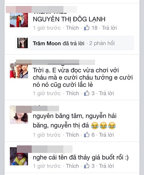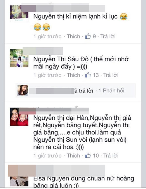 Ngay lập tức dòng chia sẻ của L.Ly đã nhận được sự giúp sức của rất nhiều bà mẹ (có cả các ông bố). Hàng nghìn cái tên đã được nghĩ ra chỉ trong ít phút, có tên nghe thật kêu như 'Nguyễn Hà Băng' nhưng cũng có cái tên vô cùng hài hước được các bà mẹ đặt để tạo không khí, đáng chú ý có: Nguyễn Thị Rét Đậm Rét Hại; Nguyễn Thị Rơi Răng; Nguyễn Lạnh Kỷ Lục...