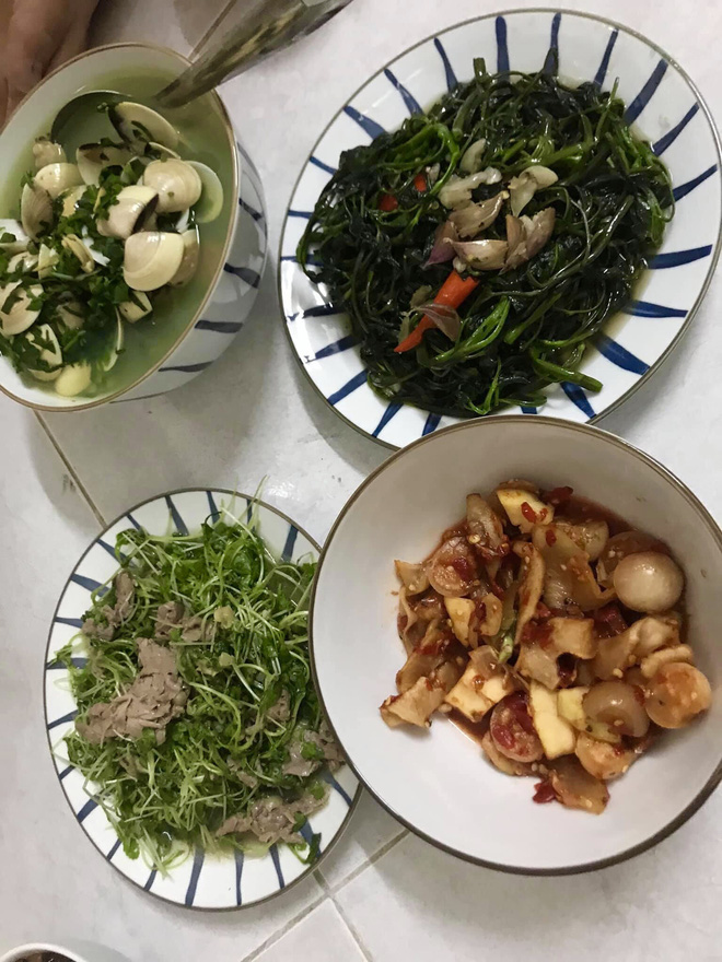 Mâm cơm với 4 món mà vợ anh N.T chuẩn bị trông khá đầy đặn, ngon miệng với đủ các món mặn, món xào, món canh. Tuy nhiên, anh N.T lại cho rằng món canh ngao nấu rau mồng tơi để cả vỏ là rất lạ, chưa thấy ai nấu như vậy bao giờ.