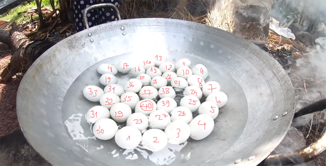 Bên cạnh đó, bà Tân giới thiệu sẽ luộc thêm 50 quả trứng vịt lộn nhưng khi đưa vào nồi chỉ có 40 quả. "Bây giờ bà bỏ trứng vào luộc nhé. Tí nữa nó chín, bỏ vào cháo nhìn cho ngon, dễ ăn. 50 quả đấy", lời giới thiệu của bà Tân trong clip.