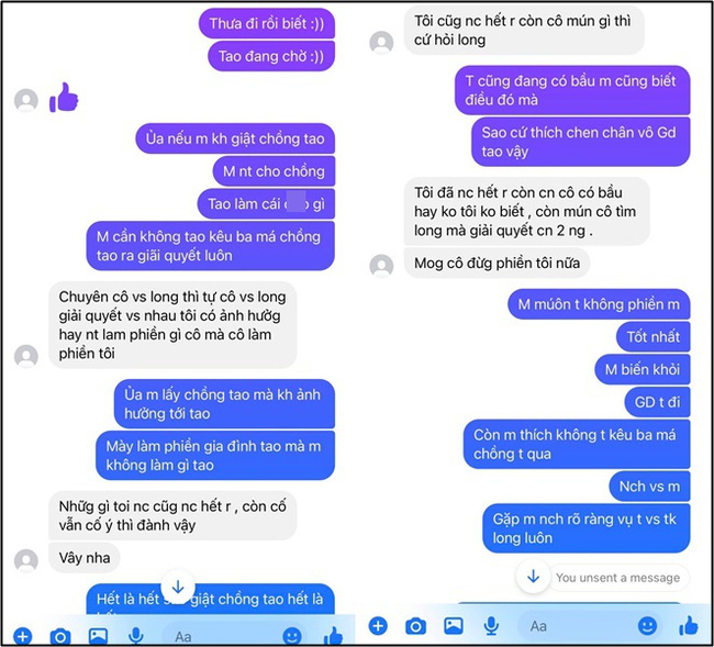 "Những câu cô chửi, sỉ nhục, lăng mạ tôi trên mạng lẫn tin nhắn tôi đều chụp hết rồi. Nếu cô còn ngoan cố chửi bới, hăm dọa nữa thì buộc tôi gửi những tin nhắn, hình ảnh này lên công an", kẻ thứ ba lên tiếng.