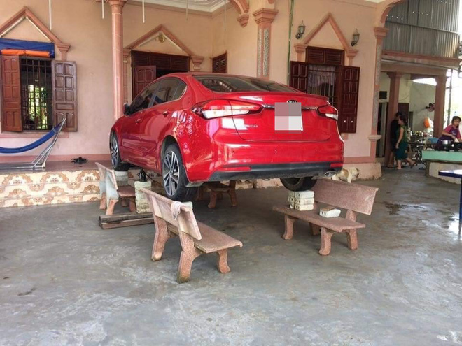 Họ chuẩn bị 4 chiếc ghế đá, kê thêm vài viên gạch rồi đặt chiếc xe lên. Đúng là việc làm kịp lúc thật bởi nước dâng lên cao nhất, xe vẫn chẳng dính nước. Như vậy tài sản sẽ được giữ an toàn, chẳng lo hỏng hóc gì hết.