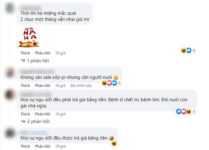 - Ôi, anh không phải nuôi em, anh chỉ cần cho tiền em mua đồ sốp pi thôi. Không thì thanh toán sốp pi hàng tháng cho em cũng được.