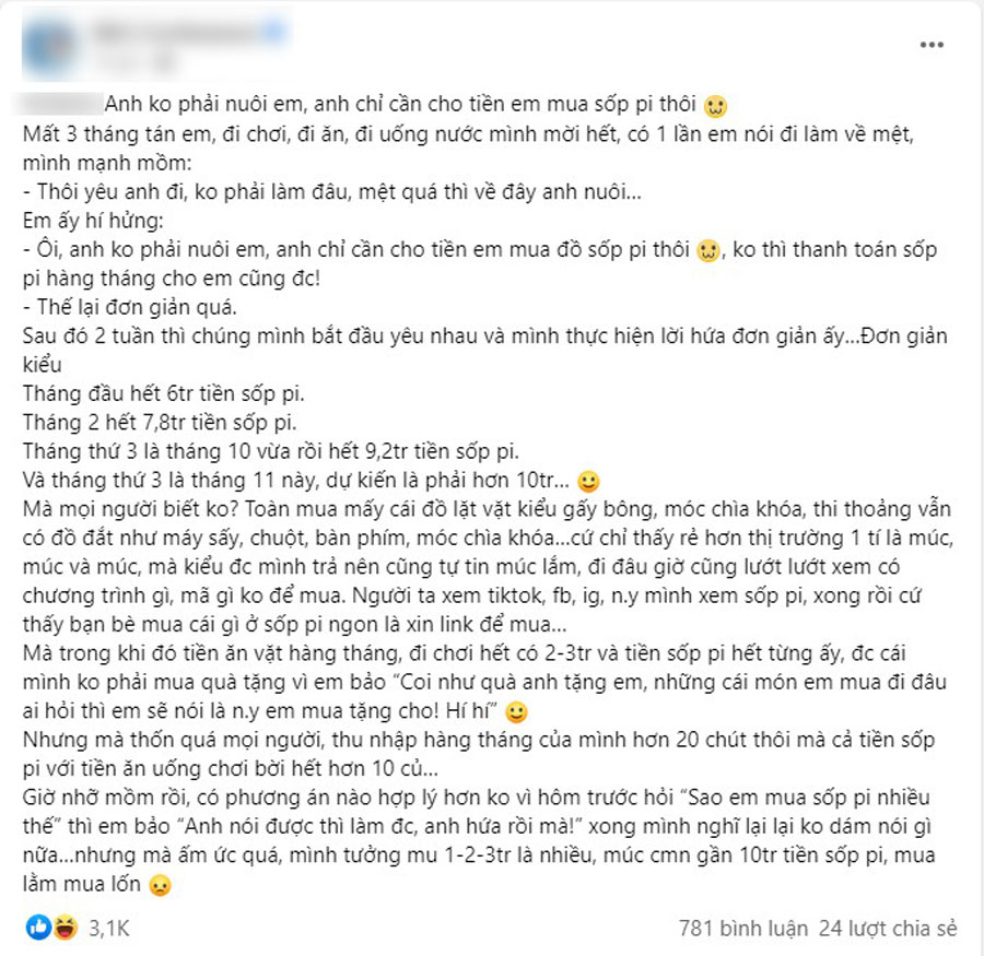 Mà trong khi đó tiền ăn vặt hàng tháng, đi chơi hết có 2-3 triệu và tiền sốp pi hết từng ấy. Được cái mình không phải mua quà tặng vì em bảo: “Coi như quà anh tặng em, những cái món em mua đi đâu ai hỏi thì em sẽ nói là người yêu em mua tặng cho! Hí hí!”