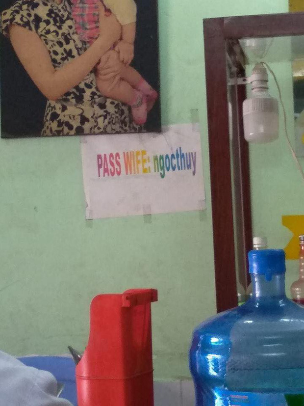Chủ quán cũng có tâm ghi mật khẩu wifi bằng Tiếng Anh rồi in hẳn tờ giấy dán lên tường. Song đáng lẽ phải ghi "pass wifi" (mật khẩu wifi), chủ quán lại đánh nhầm thành "pass wife" (pass vợ).