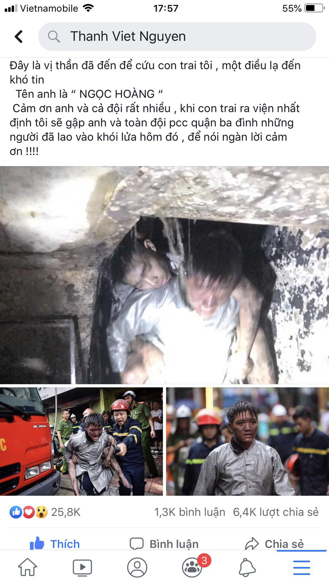Đi kèm với đó là lời cám ơn chân thành và xúc động: "Cám ơn anh và cả đội rất nhiều, khi con trai ra viện nhất định tôi sẽ đến gặp anh và toàn đội PCCC quận Ba Đình để gửi ngàn lời cám ơn – những người đã lao vào khói lửa ngày hôm đó".