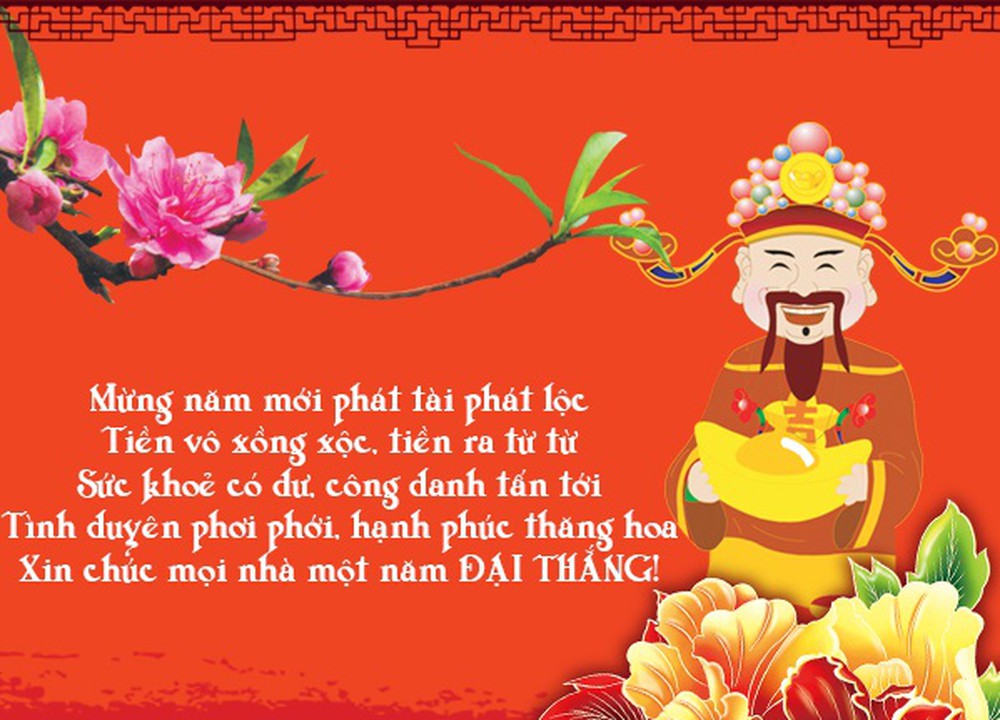 Mừng 2020 phát tài phát lộc/ Tiền vô xồng xộc, tiền ra từ từ/ Sức khoẻ có dư, công danh tấn tới/ Tình duyên phơi phới, hạnh phúc thăng hoa/ Xin chúc mọi nhà một năm đại thắng.