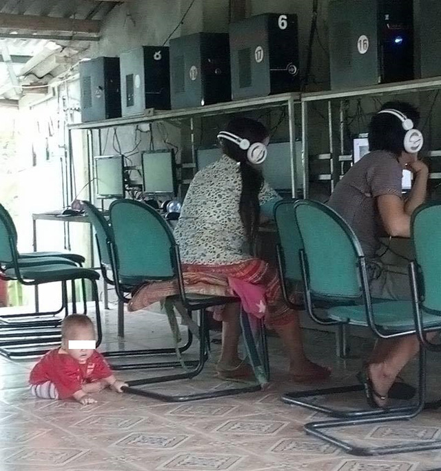Cặp đôi này thì thản nhiên chơi game bỏ mặc đứa con nhỏ bò lê la dưới đất nhìn vô cùng đáng thương.