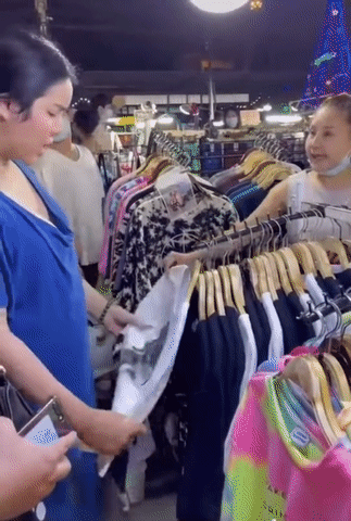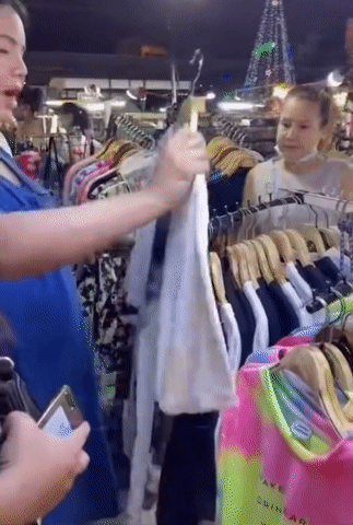 Sau khi hỏi chủ shop về chất lượng loại vải, cô gái đã khiến nhiều người bật cười khi thử thách độ co giãn trên chính chiếc váy mình đang mặc, nhằm chứng minh cho cô chủ mình "biết chọn vải".