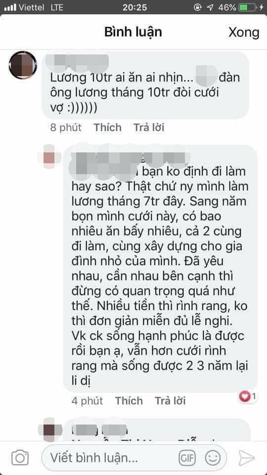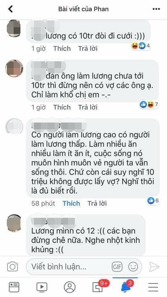 Cụ thể, câu chuyện xuất phát từ bình luận của một nữ nhân; cho rằng, đàn ông lương tháng 10 triệu đồng thì không thể lấy vợ. Ngay sau khi bình luận này được trích dẫn lại kèm theo câu hỏi mở, đã có hàng ngàn ý kiến trái chiều nhau đến từ cả hai giới được để lại bên dưới bài đăng để thể hiện sự đa dạng trong quan điểm về vấn đề này.