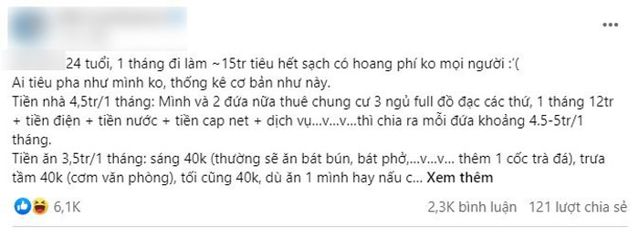 - Mình thấy là bạn gái này khá biết cách chăm chút và thỏa mãn các nhu cầu của việc sinh hoạt cá nhân. Tuy nhiên tùy cơm mà gắp mắm thôi, bạn có một mức lương trung bình thì bạn chỉ có thể lựa chọn một vài nhu cầu để thỏa mãn. Nếu bạn chọn một không gian sống thoải mái thì bạn phải bớt những nhu cầu bên ngoài lại, còn nếu bạn là một người không quá chu toàn về việc ăn ở, đi lại bạn có thể dư ra một khoản tiền để tiết kiệm hay đầu tư cho kiến thức,... Chúng ta không thể đòi hỏi 1 mức sống 30-40 triệu khi thu nhập chỉ có 15 triệu được. Nhưng dù sao nhìn cách chi tiêu của bạn thì cũng có thể hiểu bạn không có một gia đình cần lo lắng, khả năng là bố mẹ vẫn khỏe mạnh hoặc điều kiện gia đình khá tốt. Còn bao giờ có mối lo từ tự sẽ biết phải tiết kiệm thôi.