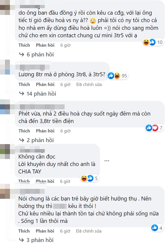 - Chia tay đi, 3,8 triệu tiền điện lên đây kể rồi mai mốt mua bỉm sữa cho con chắc gọi mách bố mẹ vợ quá. Ai kêu đồng ý cho qua, thấy tốn thì nói thẳng đi chớ đăng lên đây người yêu lại đọc được rồi.