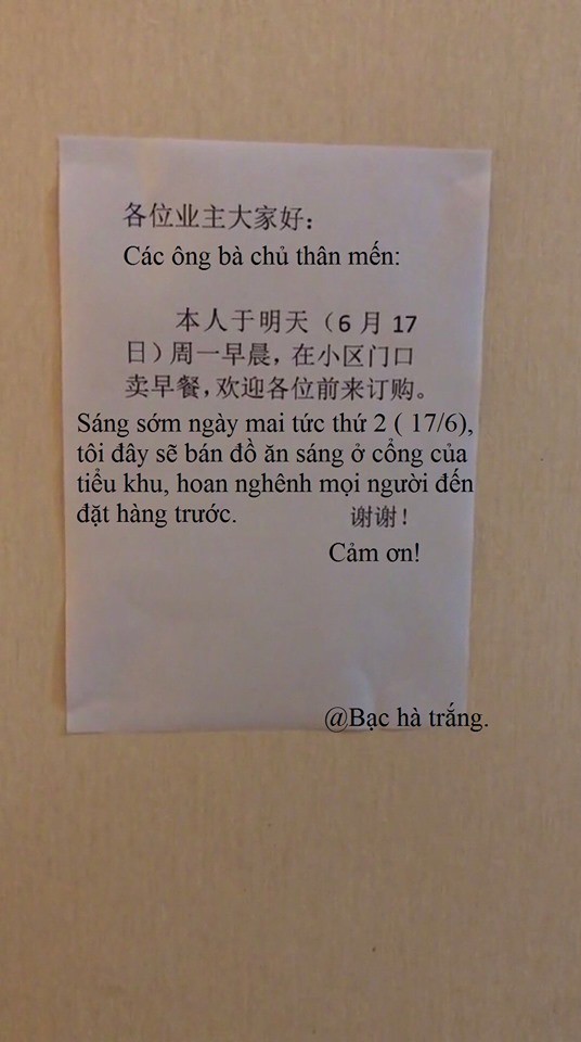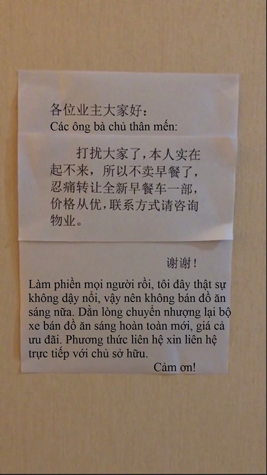 Nội dung mảnh giấy như sau: "Các ông bà chủ thân mến. Làm phiền mọi người rồi. Tôi đây thực sự không dậy nổi. Vậy nên không bán đồ ăn sáng nữa. Dằn lòng chuyển nhượng xe bán đồ ăn sáng còn mới hoàn toàn, giá cả ưu đãi. Phương thức liên hệ xin liên hệ trực tiếp với chủ sở hữu. Tôi xin cảm ơn".