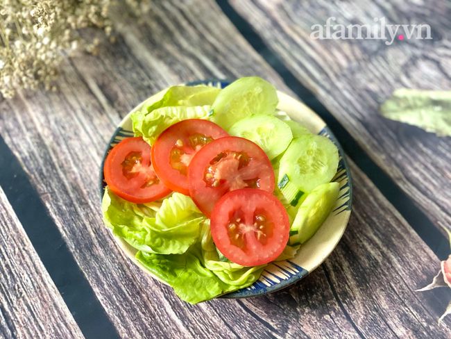 Xà lách mỡ nhặt rửa rồi ngâm nước muối pha loãng 15 phút, sau đó rửa lại sạch sẽ để ráo. Cà chua cắt lát, dưa leo gọt vỏ cắt miếng.