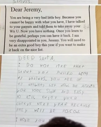 Tuy nhiên, thay vì ngoan ngoãn nghe lời ông già Noel, cậu bé Jeremy lại tỏ rõ sự bực tức. Thậm chí, em lập tức gửi thư phản pháo và đe dọa ông già Noel: "Gửi ông già Noel. Cháu không thích việc ông kéo bố mẹ cháu vào câu chuyện này. Bây giờ, ông cũng đang ở trong danh sách những người khó ưa của cháu. Trông ông thật chậm chạp, quá dễ để giết hại. Hãy thưởng thức bánh quy vào năm tới vì trong đó sẽ có thuốc độc".