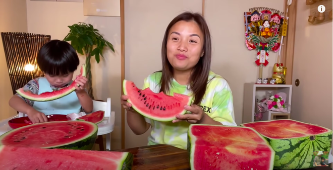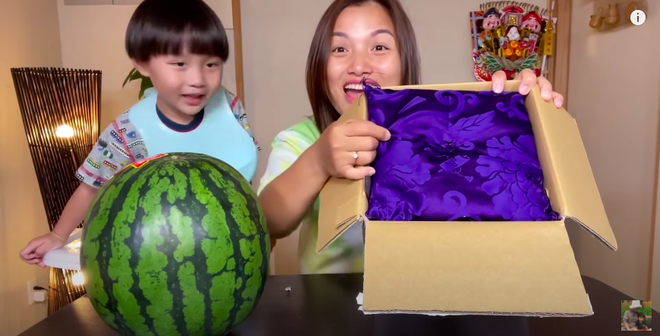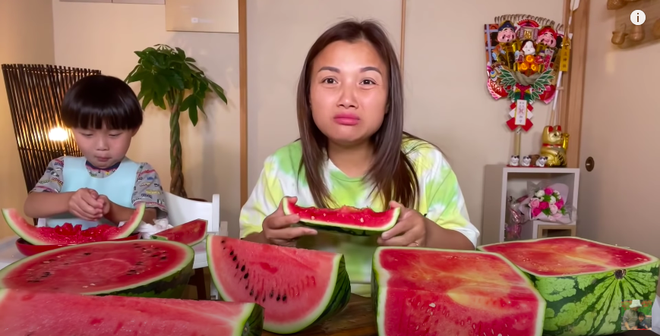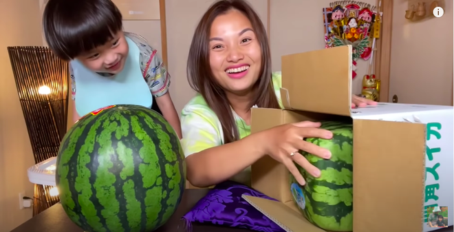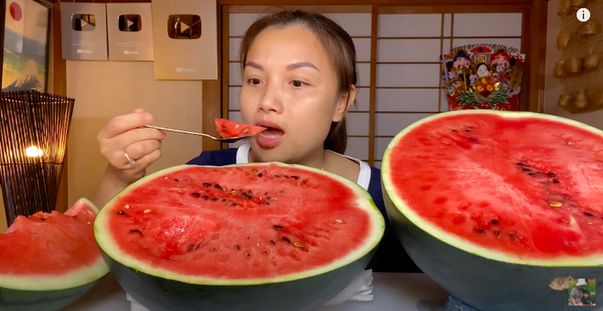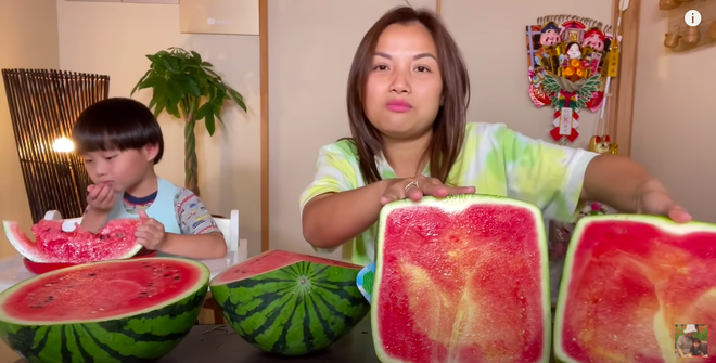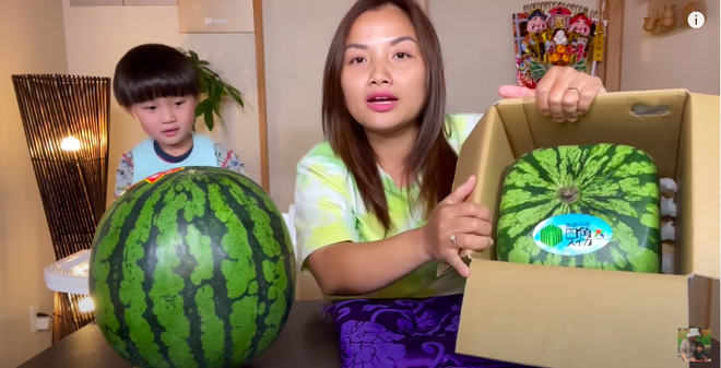 Vào năm ngoái, nữ YouTuber cũng từng bỏ ra tới 9 sen Nhật (khoảng hơn 1,8 triệu đồng) để mua 1 trái dưa hấu đen Densuke nổi tiếng về review cho khán giả. Quả dưa hấu đen nặng 10kg có vị ngọt hơn, ruột bên trong cũng dày và mọng nước hơn quả bình thường.