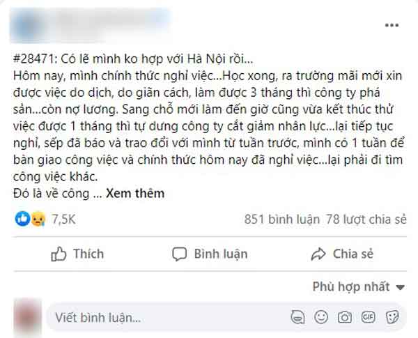 Đây là tâm sự của một cô gái trẻ trong một diễn đàn đông thành viên trên mạng xã hội. Ngay khi đăng tải đã có hàng ngàn lượt đọc và bình luận. Quả thực thủ đô là một nơi hoa lệ nhưng nếu không có năng lực cũng khó sống. Nhiều bạn trẻ chật vật mưu sinh nhiều năm không thành đã phải rời đi nơi khác hoặc về quê vì không trụ nổi. Có lẽ cũng chính vì thế mà bài viết của cô gái đã nhận được nhiều sự đồng cảm.