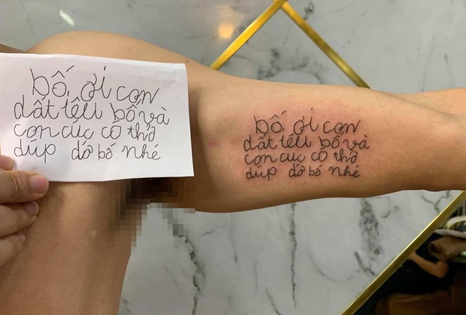 "Bố ơi, con dất iêu bố và con cúc có thở dúp dớ bố nhé" (Bố ơi, con rất yêu bố và con cũng có thể giúp đỡ bố nhé - pv), đây là những dòng chữ viết của cô con gái 4 tuổi gửi anh Tuấn Anh. Dù dòng chữ khá khó hiểu lại sai chính tả tùm lum nhưng Tuấn Anh không chỉnh sửa, thậm chí để nguyên nét chữ nghuệch ngoạc để xăm lên cánh tay.