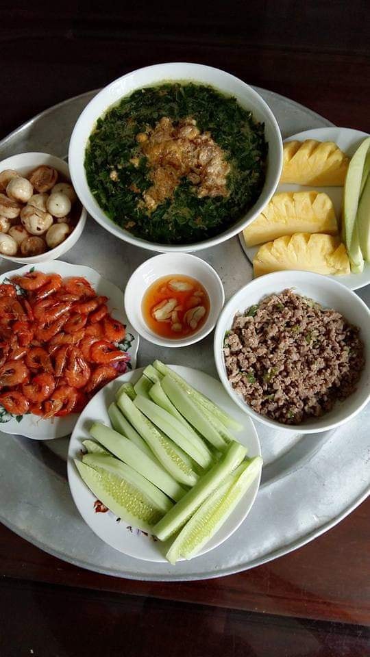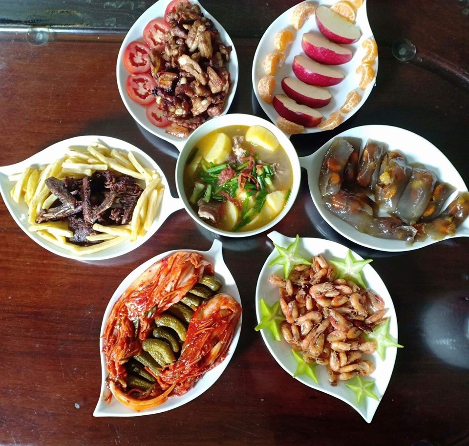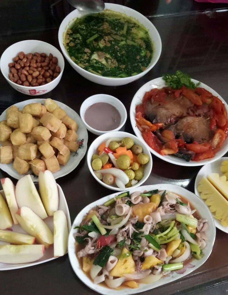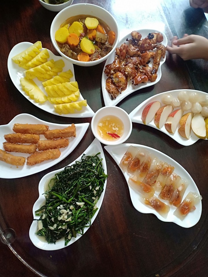 Bữa cơm của gia đình chị Phương thường có 2 – 3 món mặn, một món canh, rau và hoa quả tráng miệng, sao cho đầy đủ các nhóm dinh dưỡng. Chị cũng cố gắng xen kẽ thực đơn để bữa cơm không bị lặp món, nhàm chán. Chưa kể, bà mẹ 3 con còn rất chú trọng trong việc bày trí món ăn sao cho gọn gàng, đẹp mắt.