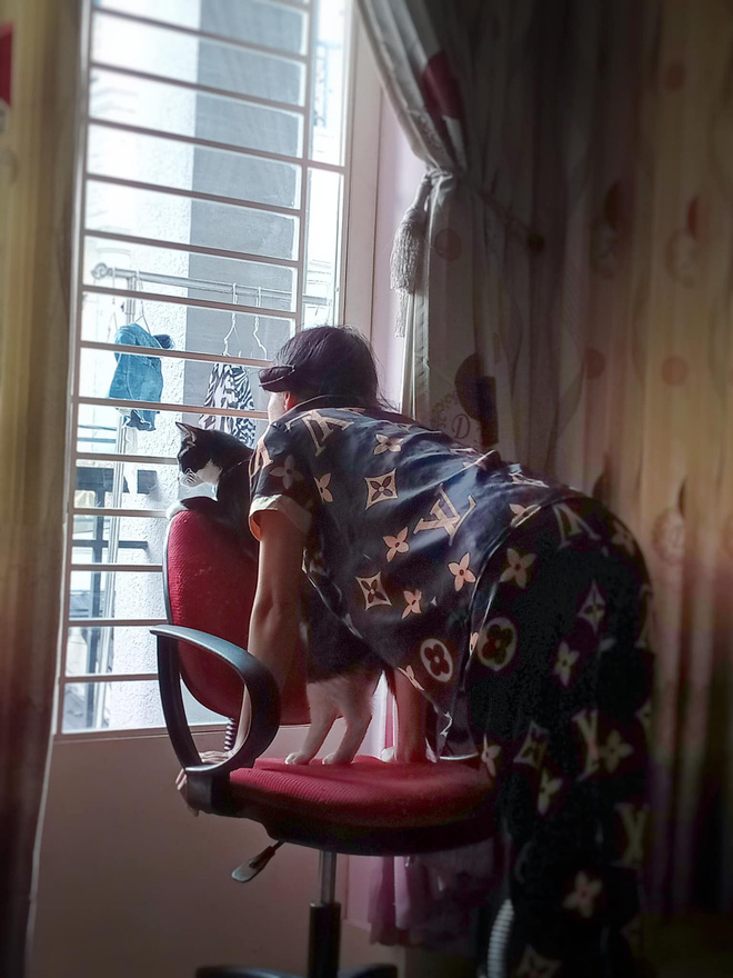 Đây không phải tình huống hiếm gặp với các gia đình cưng thú nuôi. Bức ảnh chụp một bà mẹ và con mèo đang chăm chú theo dõi sự việc nhà hàng xóm khiến nhiều người thích thú. Người con tâm sự: "Mình chỉ muốn chia sẻ hình ảnh mẹ mình và con trai ruột. Mẹ mình làm bảo mẫu cho mấy bé cấp một nhưng vì dịch nên đã chuyển sang bảo mẫu cho con quỷ này 24/7. Đây là lúc mà 2 mẹ con quá rảnh rỗi nên làm camera khu phố, hóng chuyện hàng xóm".