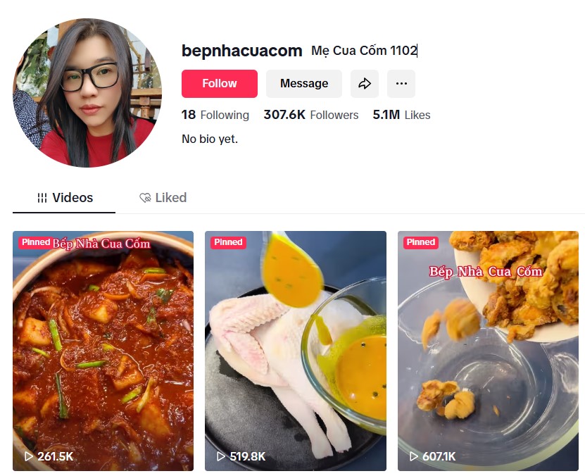 - Trên TikTok với tài khoản @bepnhacuacom có khoảng 307.000 người theo dõi và hơn 5 triệu lượt like.