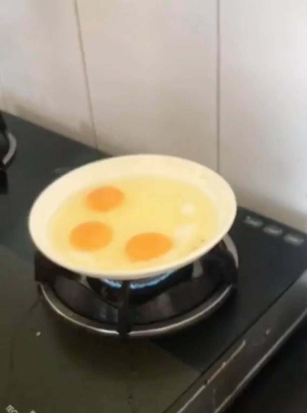 Đầu tiên bật lửa rồi đổ đầy dầu ăn vào trong đĩa, khi dầu đã nóng, mẹ cô gái liền đập 3 quả trứng vào chiên, hồi hộp chờ kết quả.