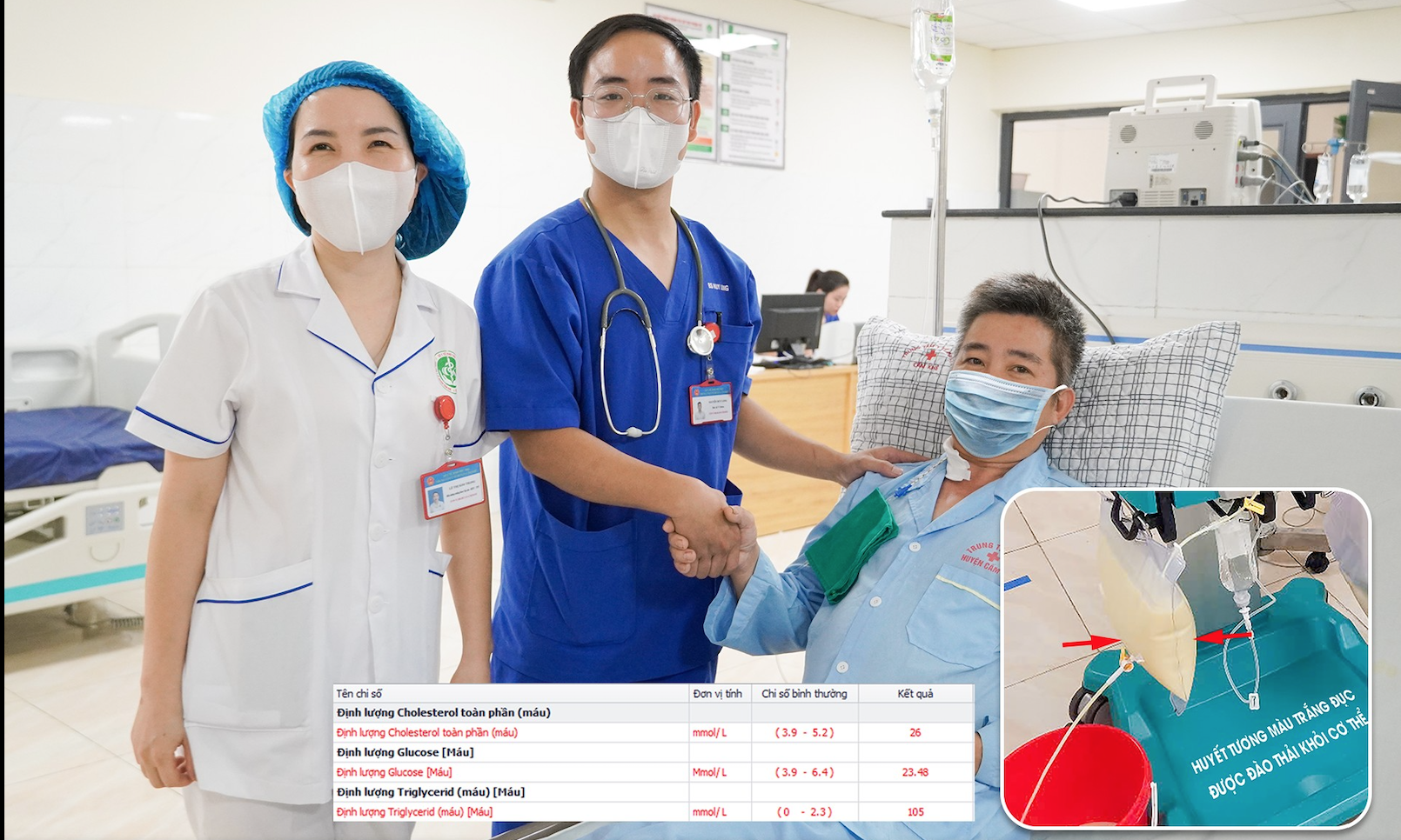 Ngay lập tức, các bác sĩ chỉ định lọc máu và thay huyết tương cấp cứu. Trong 2 giờ can thiệp lọc máu, khoảng 4.500ml dịch màu "đục như sữa", chứa hàm lượng mỡ cực cao đã được loại bỏ khỏi cơ thể bệnh nhân và thay bằng huyết tương tươi. Sau can thiệp, tình trạng đau bụng của bệnh nhân thuyên giảm, các chỉ số sinh tồn dần ổn định. Bệnh nhân xuất viện sau 11 ngày điều trị tích cực.