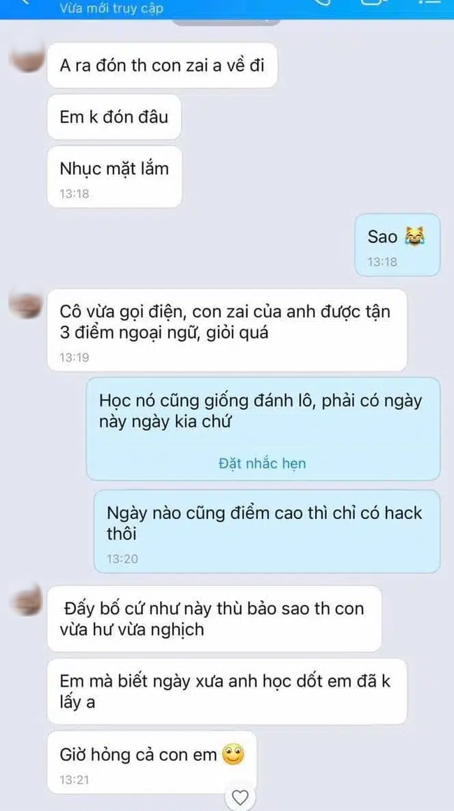 Ông bố này sau đó đăng cả ảnh chụp màn hình tin nhắn của vợ. Trong khi bà mẹ kêu chồng "Anh ra đón con trai anh về đi" và than vãn "Cô vừa gọi điện, con trai của anh được 3 điểm Ngoại ngữ" thì ông bố cố cứu vớt tình hình bằng cách so sánh cực kỳ lầy lội: "Học nó cũng giống đánh lô. Phải có ngày nọ ngày kia chứ. Ngày nào điểm cũng cao thì chỉ có "hack" thôi".