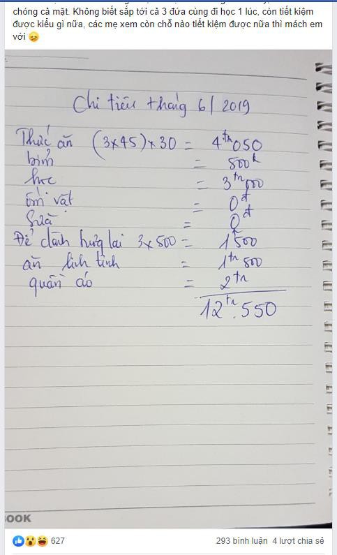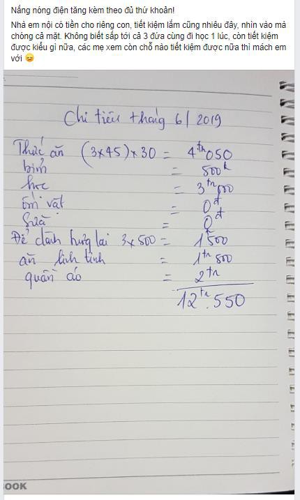 Cụ thể một tài khoản Facebook có tên H.N đã đăng tải bảng chi tiêu tháng 6 và clip 3 bé sinh 3 khỏe mạnh đang chơi đùa cùng nhau. Nhìn qua thì chẳng có gì đặc biệt cho đến khi dân mạng chú ý đến nội dung trong bảng chi tiêu có mục "sữa 0 đồng và ốm vặt 0 đồng" kèm theo dòng chú thích: " Nắng nóng điện tăng kèm theo đủ thứ khoản! Nhà em nội có tiền cho riêng con, tiết kiệm lắm cũng nhiêu đây, nhìn vào mà chóng cả mặt. Không biết sắp tới cả 3 đứa cùng đi học 1 lúc, còn tiết kiệm được kiểu gì nữa, các mẹ xem còn chỗ nào tiết kiệm được nữa thì mách em với"