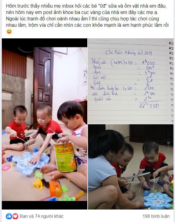 Câu chuyện nhanh chóng nhận về rất nhiều lượt thích và bình luận ngưỡng mộ của dân mạng: "Công nhận chị chăm con khéo thật đấy, có đến ba con luôn cơ mà"; "Nhà này chăm con khéo quá không tốn đồng nào đưa con đi viện cả"; "Ôi mẹ chăm ba con mà chi tiêu chỉ có thế này thôi à"; "Như thế này là tiết kiệm khéo lắm nè chị ba đứa vậy mà chi phí ít, tiền viện 0 đồng luôn á…"