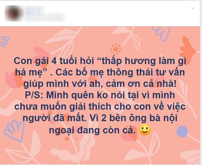 "Con gái 4 tuổi hỏi thắp hương làm gì hả mẹ? Các bố mẹ thông thái tư vấn giúp mình với ạ, cảm ơn cả nhà! P/s: Mình quên không nói mình chưa muốn giải thích cho con về việc người đã mất vì 2 bên ông bà nội ngoại đang còn cả".