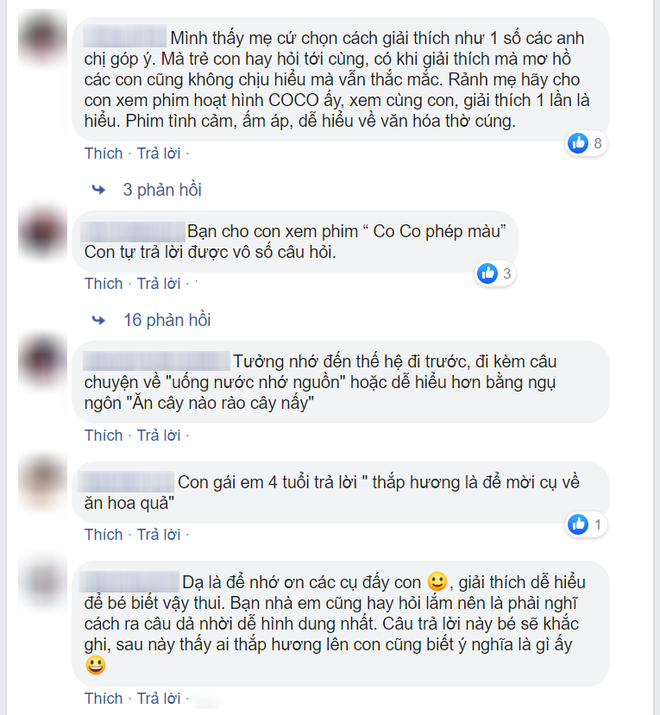 - Mình thấy mẹ cứ chọn cách giải thích như 1 số các anh chị góp ý. Mà trẻ con hay hỏi tới cùng, có khi giải thích mà mơ hồ các con cũng không chịu hiểu mà vẫn thắc mắc. Rảnh mẹ hãy cho con xem phim hoạt hình "Coco" ấy, xem cùng con, giải thích 1 lần là hiểu. Phim tình cảm, ấm áp, dễ hiểu về văn hóa thờ cúng.