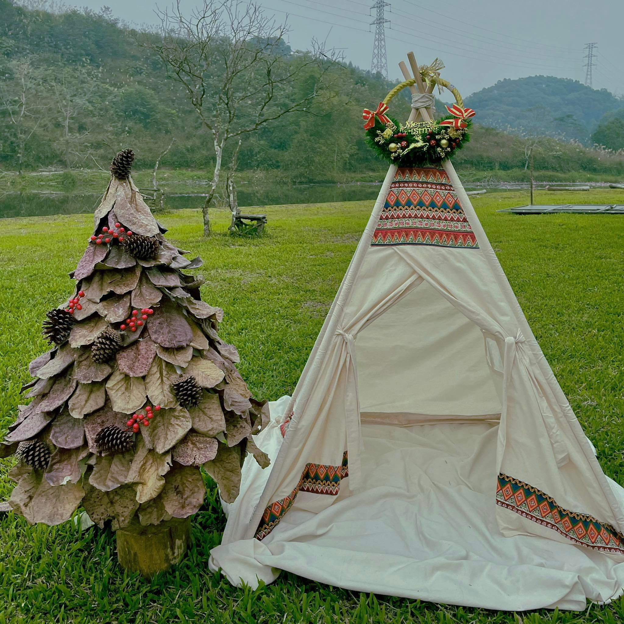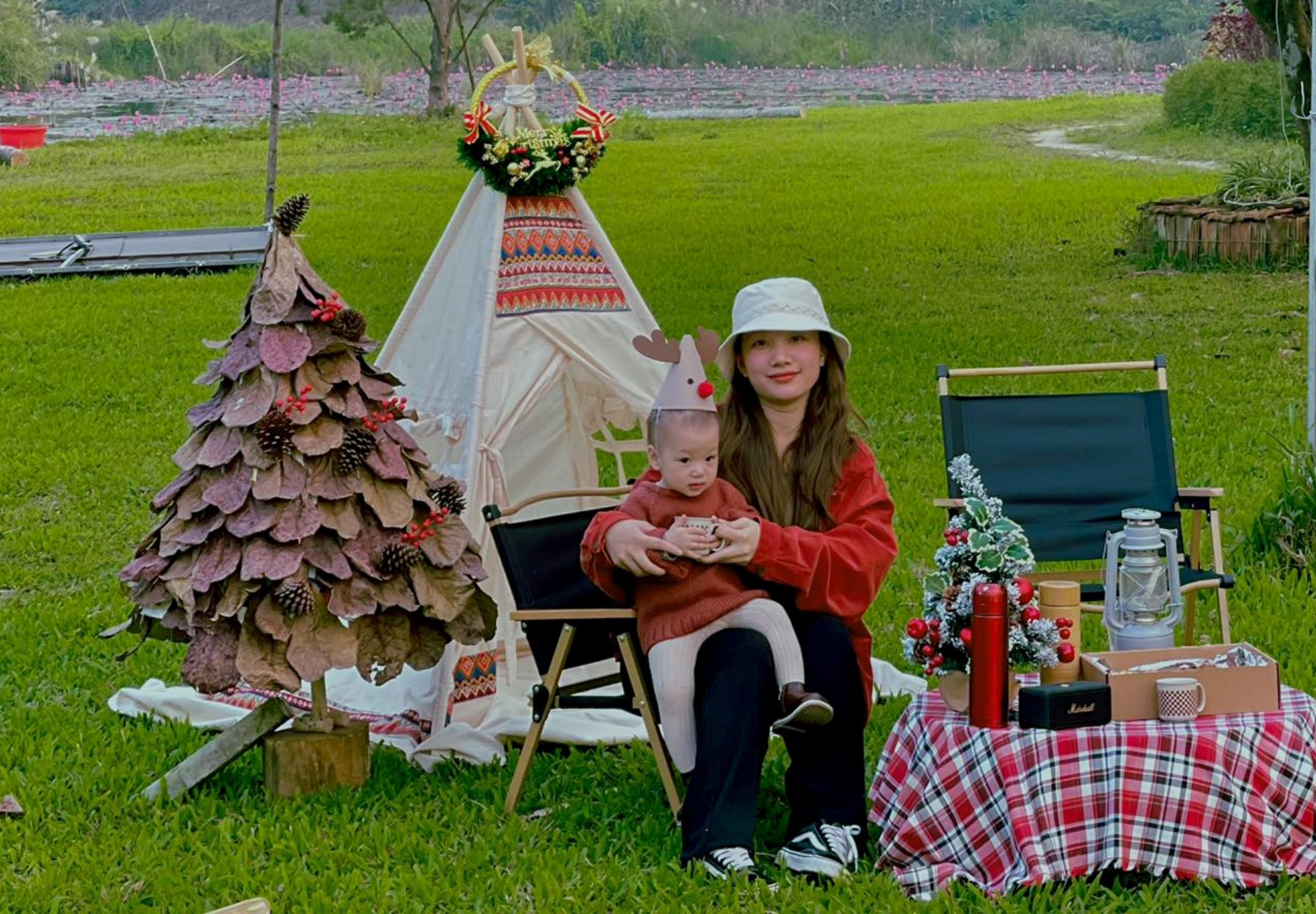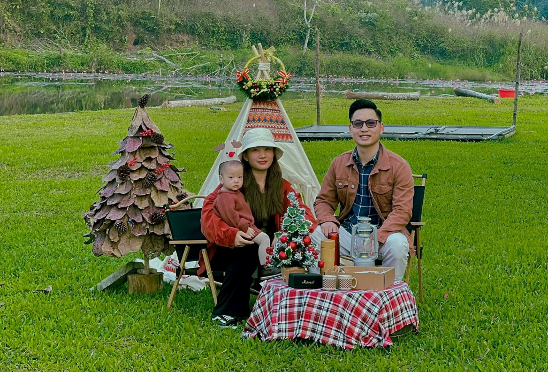 Chồng của chị Ngọc ủng hộ mọi ý tưởng mới mẻ của vợ. Anh hỗ trợ chị Ngọc làm khung cây thông Noel. Khi chị muốn mang cây thông để chụp ảnh picnic, anh cũng chiều theo ý, khuân vác cây giúp vợ.