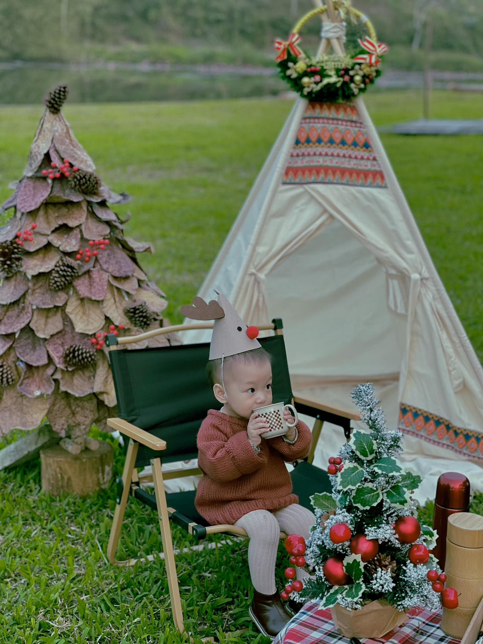 Bên cạnh đó, chị Ngọc rất thích chụp ảnh cho con gái 1 tuổi. Chị thường lên các ý tưởng độc lạ, được làm hoàn toàn bằng tay để chụp ảnh cho bé. Với cây thông Noel bằng lá khô, con gái của chị rất thích thú. Trong thời gian chị Ngọc làm cây, bé luôn ngồi cạnh để quan sát. Lúc chụp ảnh với cây thông do mẹ làm, bé gái ngồi ngoan và rất hợp tác.