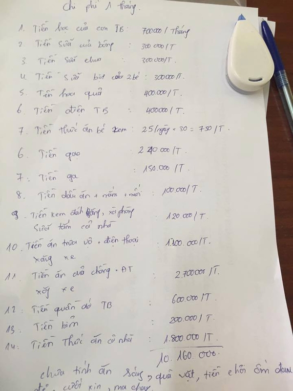 | Cụ thể: -Tiền học của con trung bình: 700.000 đồng/tháng -Tiền sữa của bông: 300.000 đồng/tháng -Tiền sữa chua: 300.000 đồng/tháng -Tiền sữa bột của 2 bé: 300.000 đồng/tháng -Tiền hoa quả: 400.000 đồng/tháng -Tiền điện trung bình: 400.000/tháng -Tiền thức ăn 2 con: 25.000 đồng/ngày x 30 ngày = 750.000 đồng/tháng -Tiền gạo: 210.000 đồng/tháng -Tiền gas: 150.000 đồng/tháng -Tiền dầu ăn + mắm, muối: 100.000 đồng/tháng -Tiền kem đánh răng, xà phòng, sữa tắm cả nhà: 120.000 đồng/tháng -Tiền ăn trưa vợ + điện thoại + xăng xe: 1.100.000 đồng/tháng -Tiền ăn của chồng + điện thoại + xăng xe: 2.700.000 đồng/tháng -Tiền quần áo trung bình: 600.000 đồng/tháng -Tiền bỉm: 200.000 đồng/tháng - Tiền thức ăn cả nhà: 1.800.000 đồng/tháng Tổng cộng: 10.130.000 đồng/tháng |