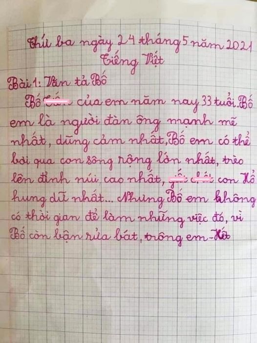 Người bố trong bài văn miêu tả của cậu bé này có lẽ không cần phải leo núi hay lội sông để chứng minh bản thân dũng cảm, chỉ riêng việc anh có thể dành nhiều thời gian để "rửa bát, trông em" thì anh đã xứng đáng là người chồng, người cha tuyệt vời nhất của gia đình rồi.