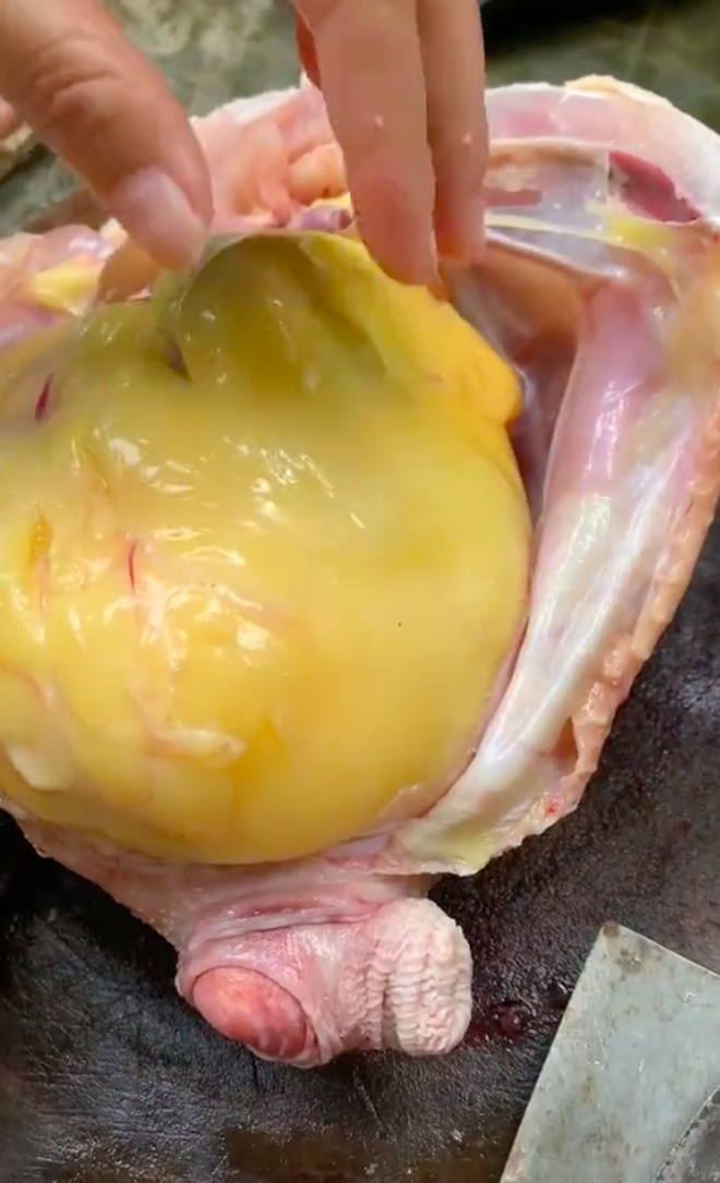 Có lẽ, đúng là chú gà này đã sắp sửa đẻ trứng nhưng vì khối mỡ quá lớn chèn ép đã khiến những quả trứng không thể ra được và kẹt mãi trong bụng gà.