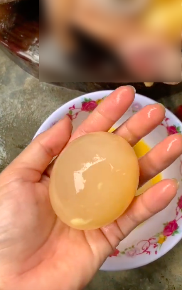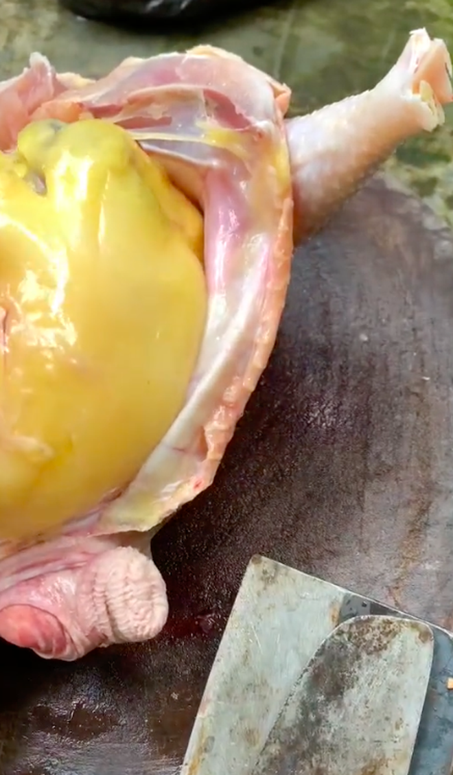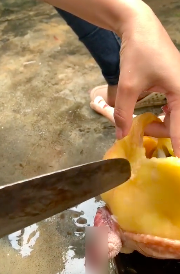 Chưa hết bất ngờ vì khối mỡ quá lớn bên trong bụng gà, dân mạng lại sửng sốt hơn nữa khi gia chủ quyết định vạch khối mỡ đó ra.