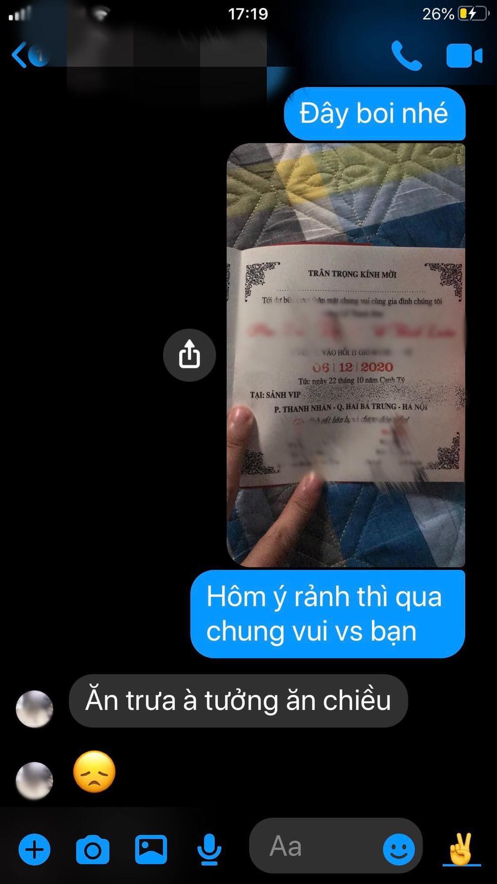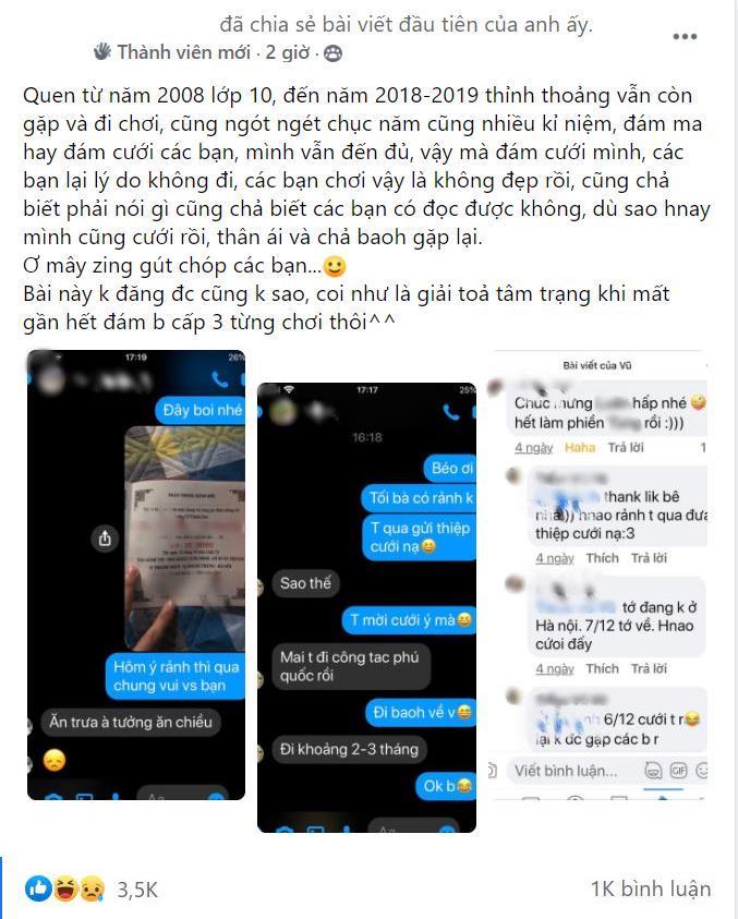 Quá bức xúc trước việc này, V. V đã đăng những hình ảnh tin nhắn giữa mình và hội bạn để giải tỏa. Ngay lập tức, bài viết nhận về những luồng ý kiến trái chiều. Đa phần nhiều người cho rằng hội bạn của V. V không hề xem anh là bạn, tiếc tiền cưới hơn là đến chung vui cùng bạn. Một số khác thì cho rằng, có thể do anh mời qua tin nhắn nên họ từ chối.