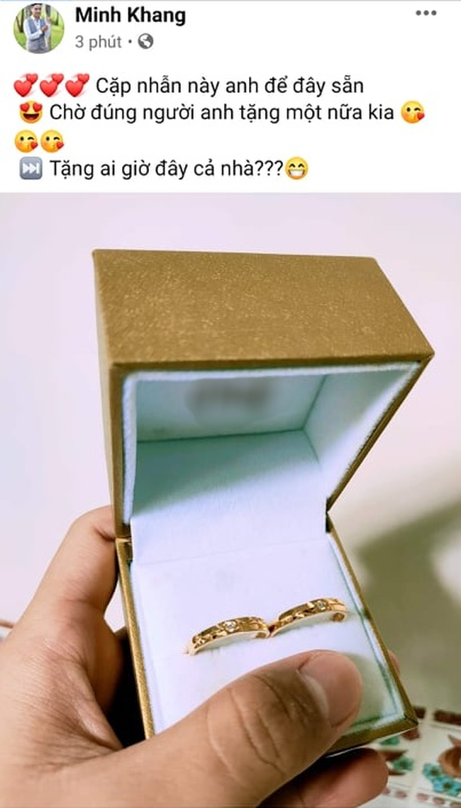 Tiếp đó, mới nhất, Minh Khang đăng tải hình ảnh một cặp nhẫn cưới và lời bày tỏ: “Cặp nhẫn này anh để đây sẵn, chờ đúng người anh tặng một nửa kia”.