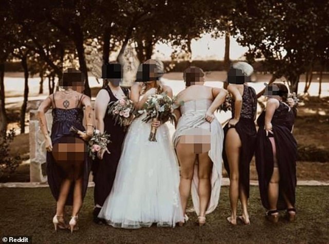 Cụ thể là trong lúc chụp ảnh cưới lưu niệm cùng cô dâu, 4 cô phù dâu này không hiểu đã suy nghĩa gì mà chọn đúng lúc bấm máy ảnh để quay lưng lại và đồng loạt vén váy lên để lộ vòng ba trong sự ngỡ ngàng của cô dâu cùng toàn bộ quan khách. 2 trong số 4 cô gái này thậm chí còn để lộ cả nội y và toàn bộ vòng ba, khiến cảnh tượng trông vô cùng hở hang và phản cảm.