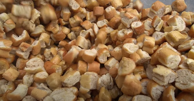 Đầu tiên bà Tân cắt bánh mì, có lẽ vì ít ăn bánh mì ngào đường ngoài tiệm nên những miếng cắt nhỏ của bà trông không quen mắt lắm.