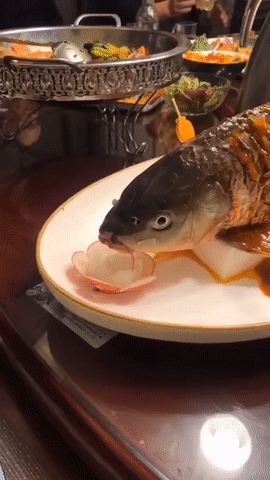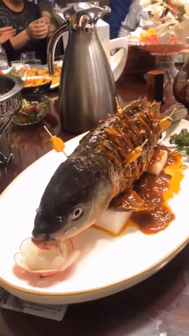 Mặc dù đầu bếp đã nấu chín phần thân, cạo sạch vảy nhưng chú cá vẫn thở và được rưới lên mình loại nước sốt màu nâu đậm.